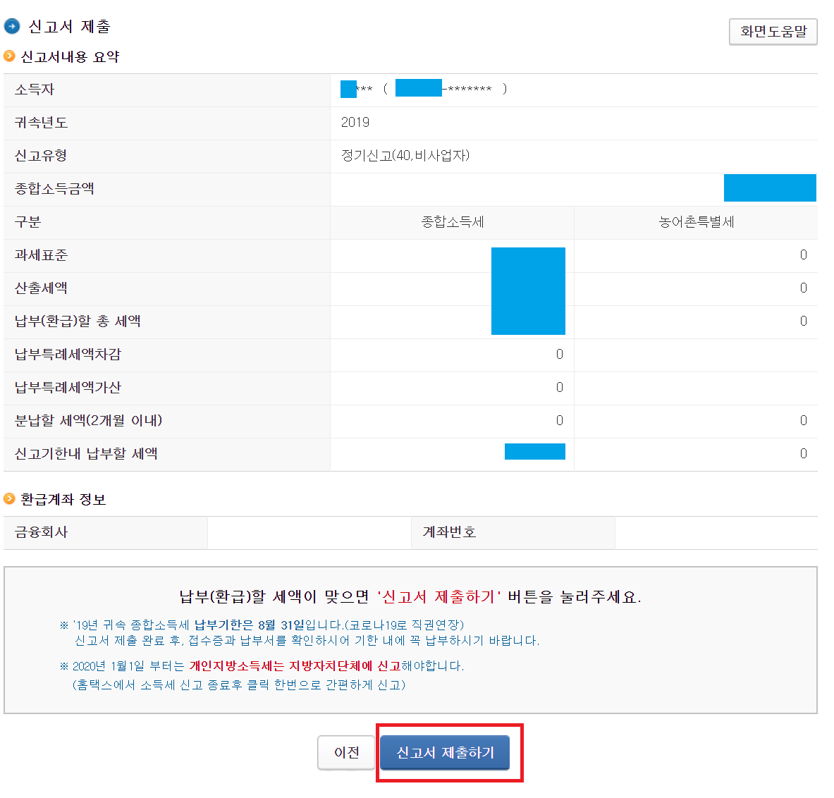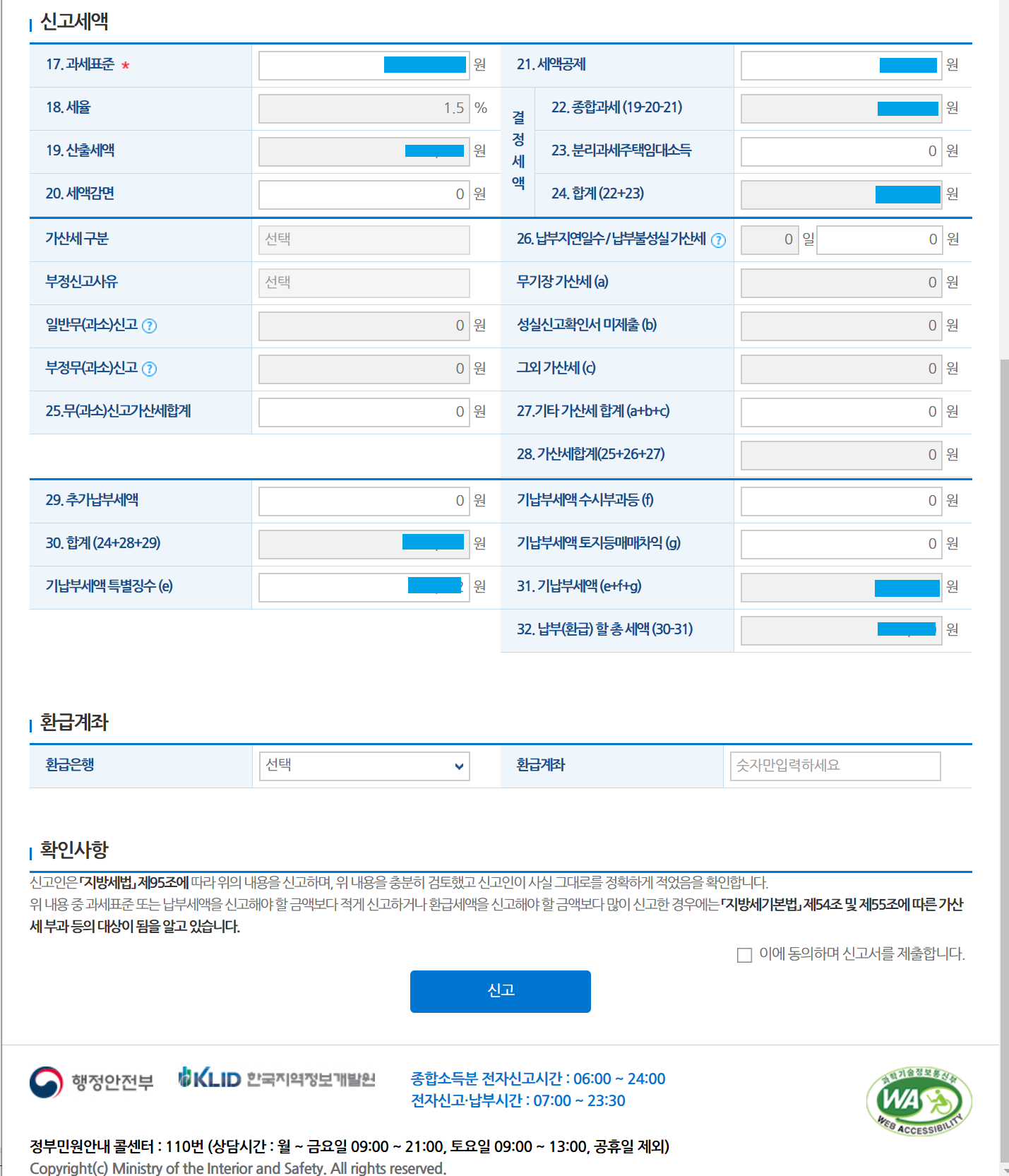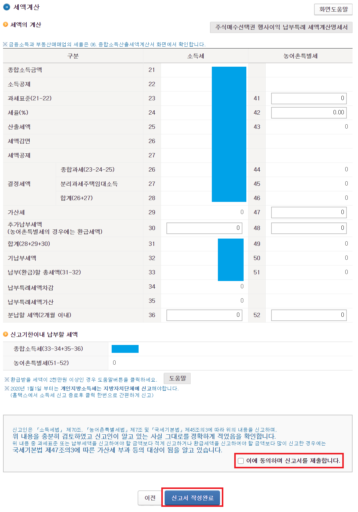 세액계산 ==> 확인 후 “이에 동의하며 신고서를 제출합니다.” 체크 후 신고서 작성완료를 누르면 마무리된다.