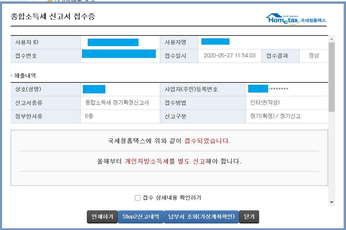 신고서 제출하기를 클릭하면, 종합소득세 신고서 접수증 팝업이 나타난다.