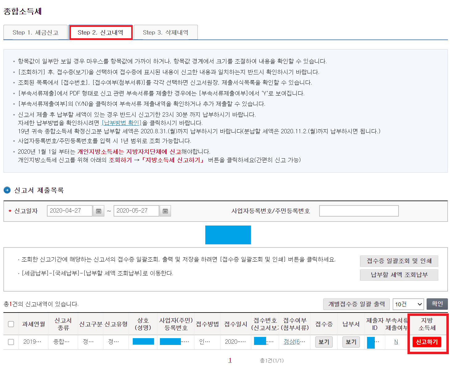 Step2. 신고내역을 클릭하면 신고내역을 조회할 수 있으며, 접수증과 납부서를 인쇄할 수 있다. 개인지방소득세 신고는 “신고하기”를 눌러서 진행하면 된다.