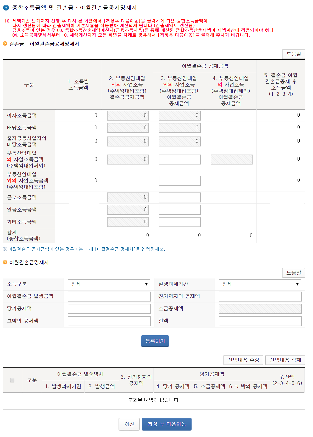 저장 후 다음이동 버튼 클릭, 이월결손금이 있다면 등록하고 다음으로 넘어간다.