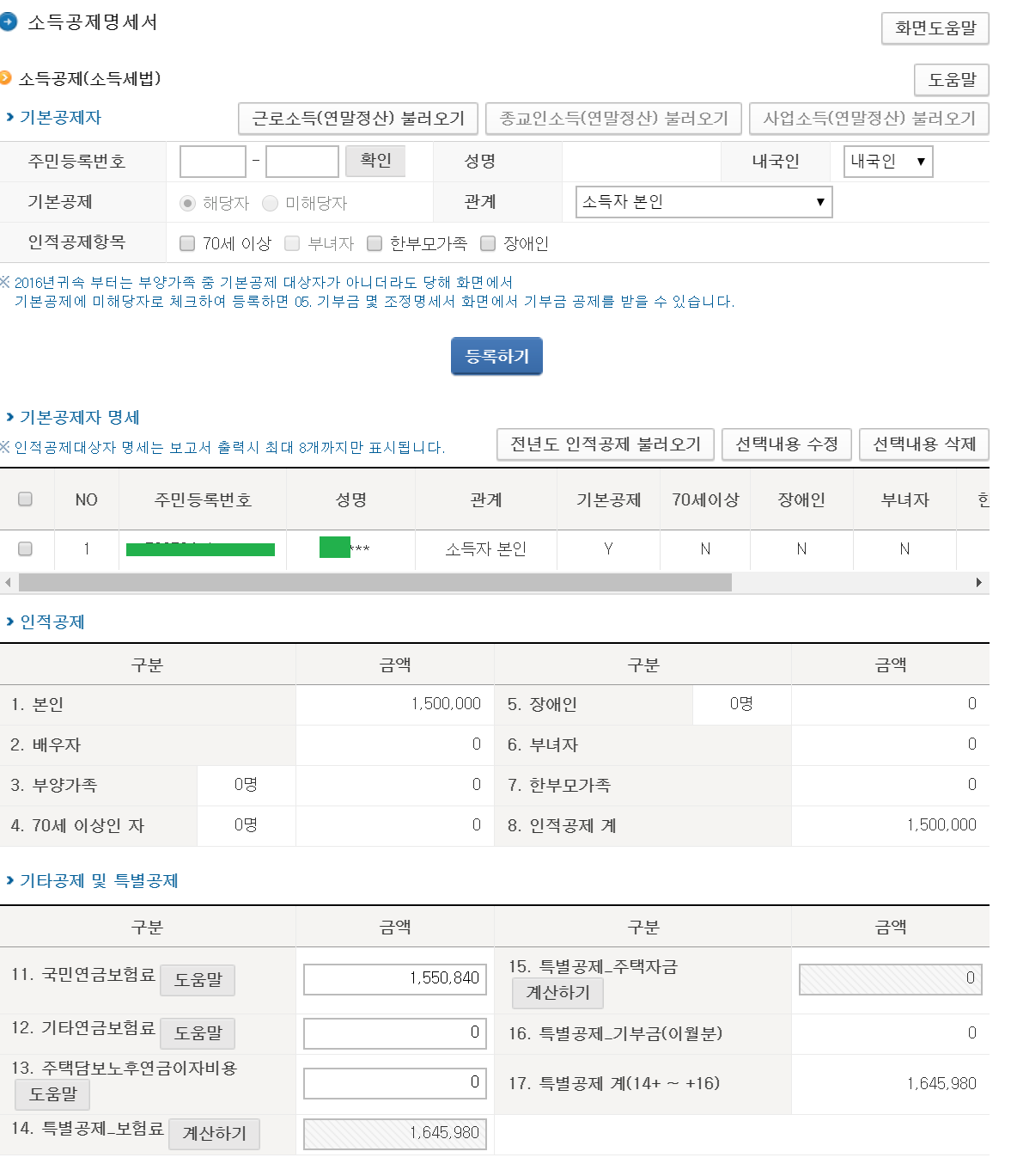 소득공제명세서 ==> “근로소득(연말정산) 불러오기를 클릭하거나, 주민등록번호 입력후 확인 버튼 눌러서 불러오면 된다. 기타 내용수정이 필요하다면 수정 후 다음으로 넘어간다.