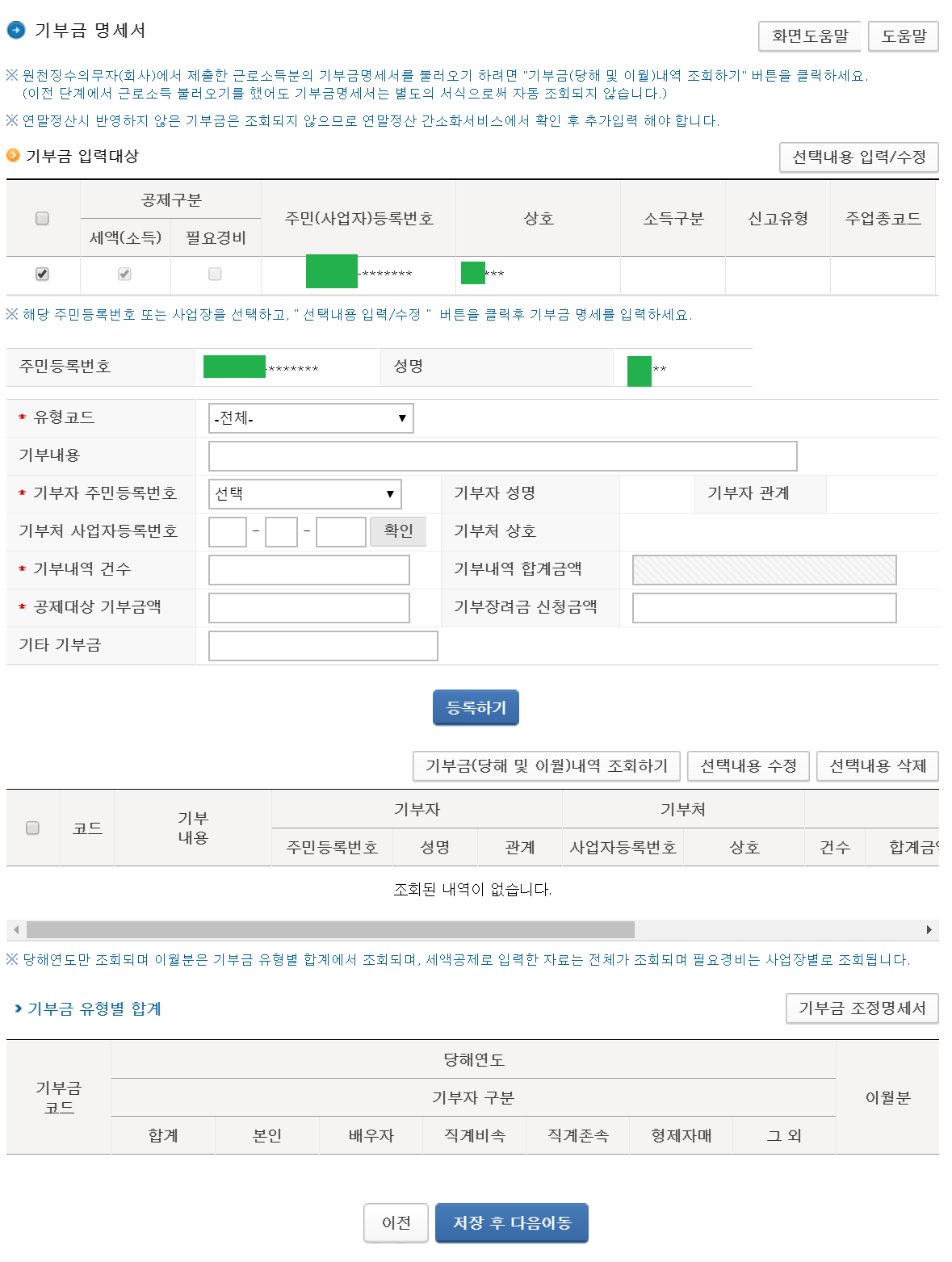 기부금 명세서 ==> 기부금이 있으면 등록한다. 없다면, “저장 후 다음이동” 클릭