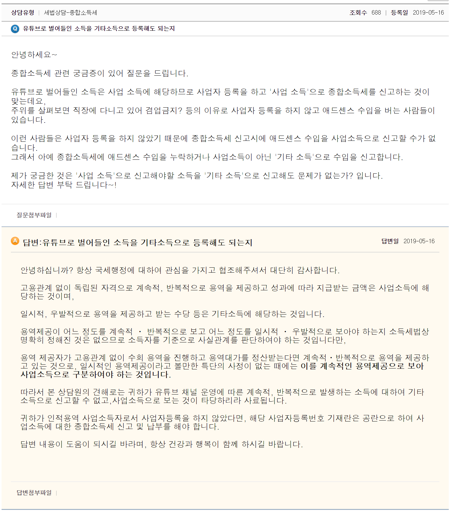 답변:유튜브로 벌어들인 소득을 기타소득으로 등록해도 되는지