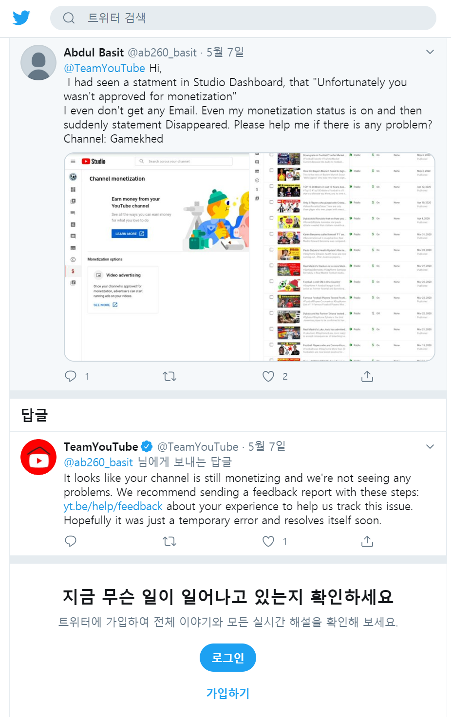유튜브에 로그인 후 나의 채널의 스튜디오에 들어갔을 때 페이지 상단에 “안타깝게도 채널의 수익 창출이 승인되지 않았습니다.” 라는 문구가 보이시나요? 유튜브 고객센터(영미권)에서도 똑같은 현상이 일어나고 있는 현상이며, 저작권 경고를 받지 않았던 채널들에서도 일어나고 있는 현상입니다.