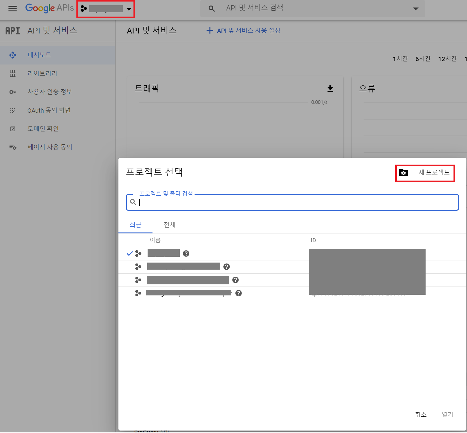 1. Google Developers Console 사이트에 접속하여 상단 역삼각형 모양을 클릭 후 “새 프로젝트”를 클릭한다.