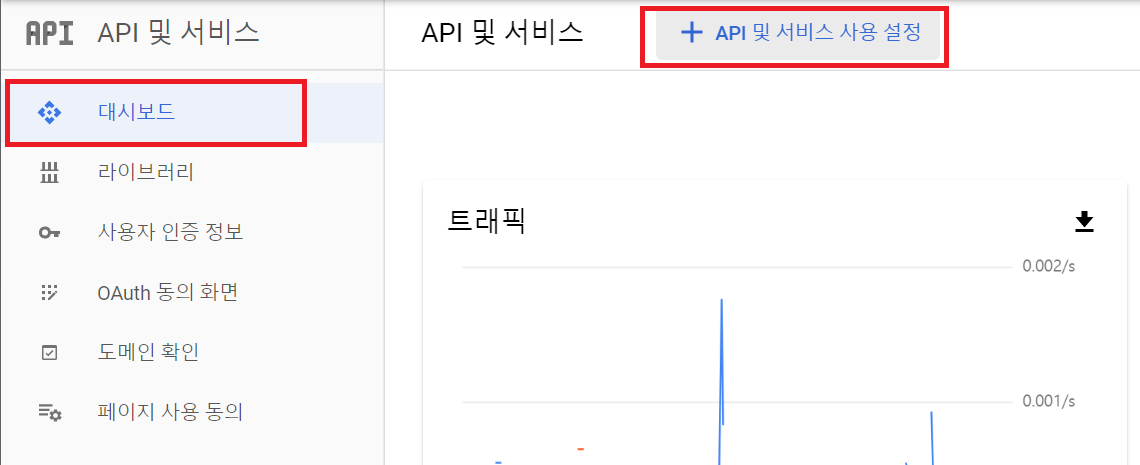 2. 왼쪽메뉴에서 대시보드를 클릭후 “API 및 서비스 사용 설정”을 클릭한다.