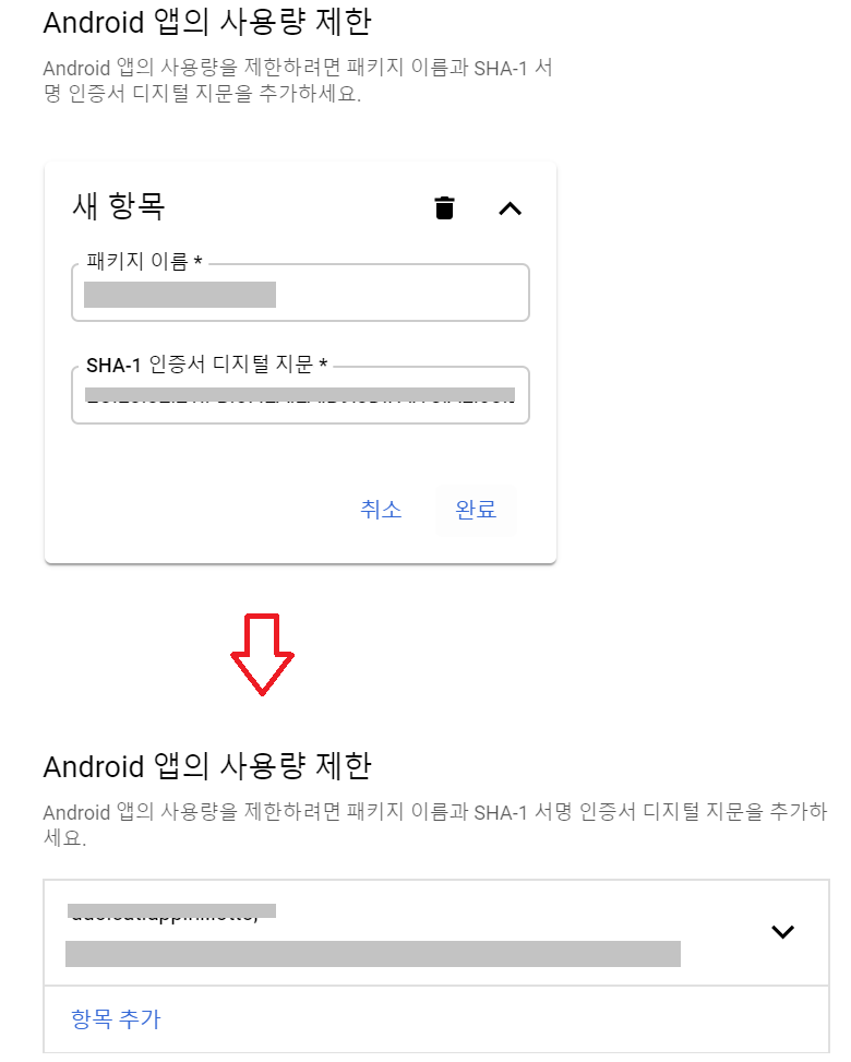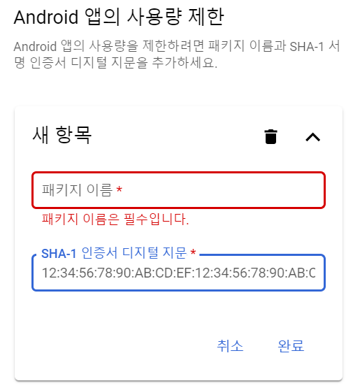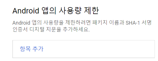 8. Android 앱의 사용량 제한에서 “항목 추가”를 클릭한다. 패키지 이름을 입력하고, SHA-1 인증서 디지털 지문 값을 입력한다. SHA-1 인증서 디지털 지문을 생성해보자. 생성방법은 우리가 보고 있는 페이지에 상세하게 잘 나와있다.