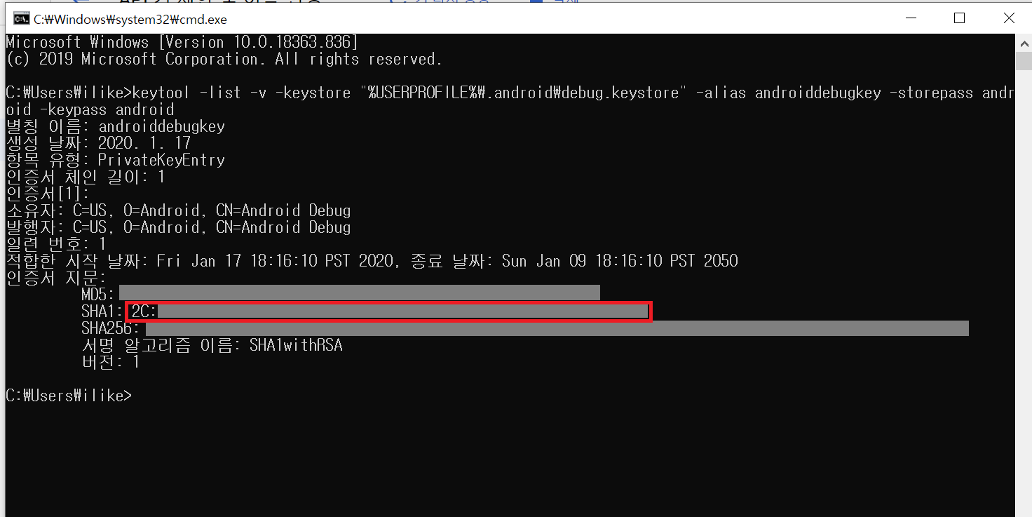 명령어를 실행하면 몇 초 뒤 인증서 지문이 생성된다. SHA1: 뒤에 값들을 복사한다.