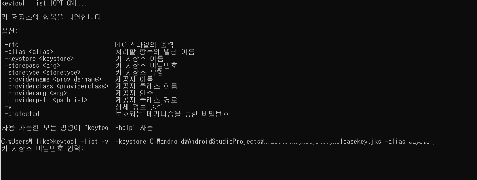 [마켓 등록시] 릴리즈 키와 알리아스를 적용 후 명령어를 실행하면, 패스워드를 물어보게된다. 패스워드 입력 하면 디버깅용과 동일하게 SHA1값을 획들할 수 있다.