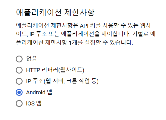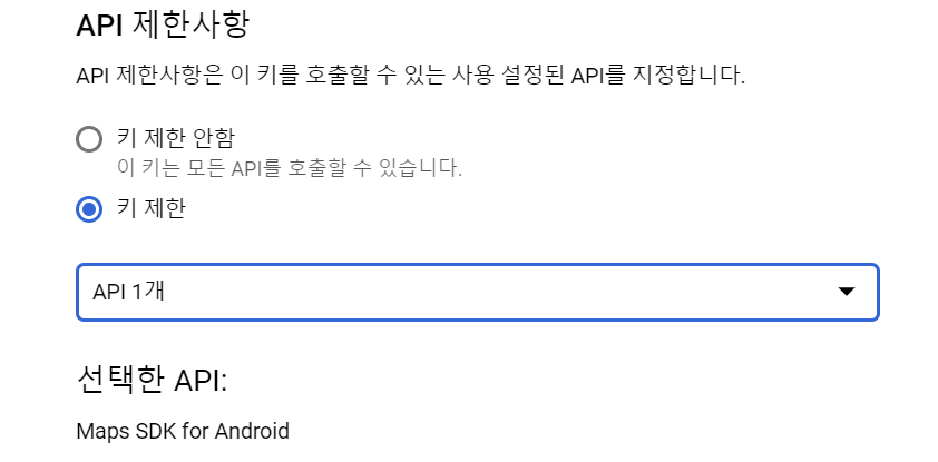 11. API 제한 사항에서 “키 제한”을 선택하고 콤보박스에서 “Maps SDK for Android”를 체크한다.