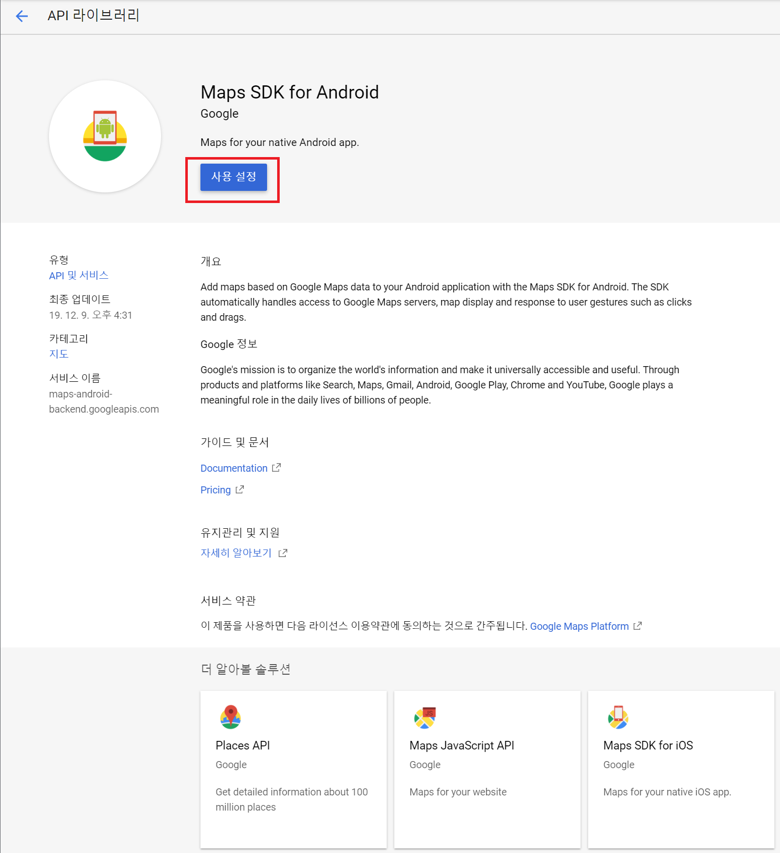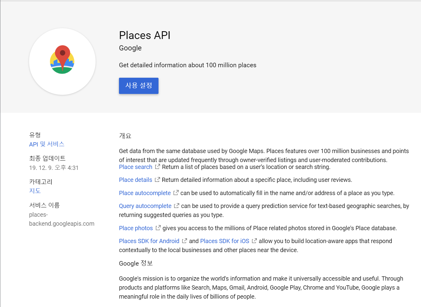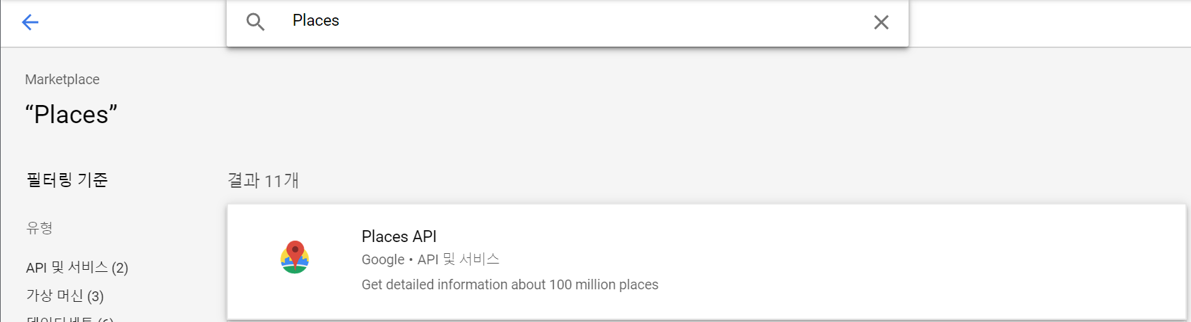 4-1. 추가적으로 Places API를 추가하고 싶다면, Places로 검핵 후 “사용설정”을 클릭하면된다.