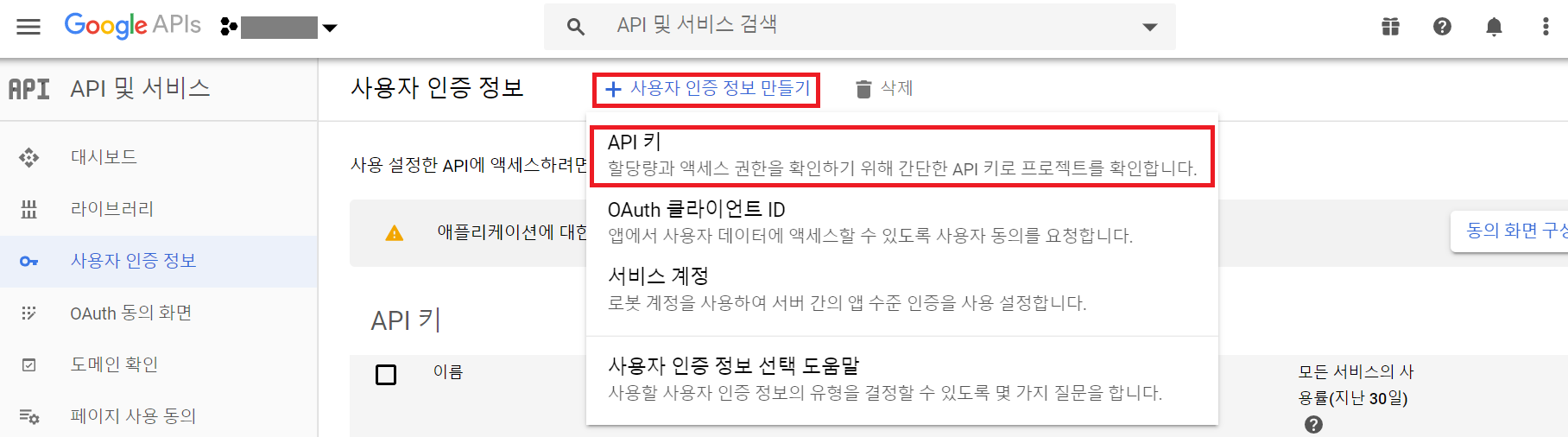 5. 사용설정이 완료되었다. 다음으로 사용자 인증 정보를 클릭 후 “사용자 인증 정보 만들기”를 클릭 후 API키를 클릭한다.