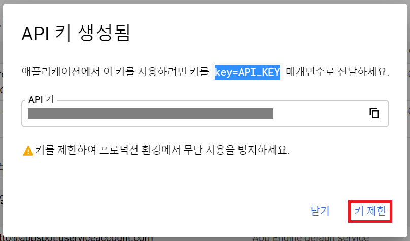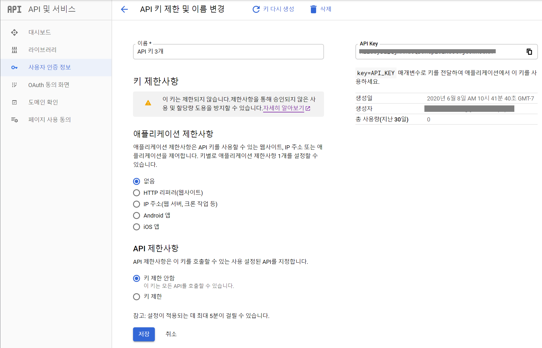 7. API 키 제한 및 이름 변경 페이지가 나타난다.