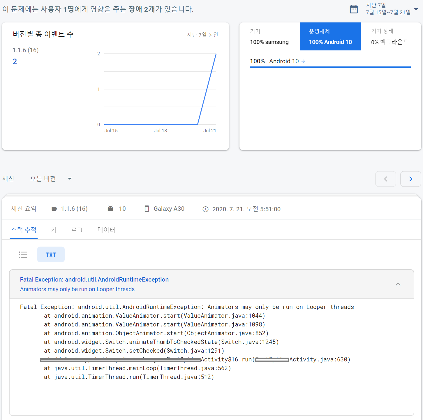 [파이어베이스 크래시틱스 오류보고 내용]