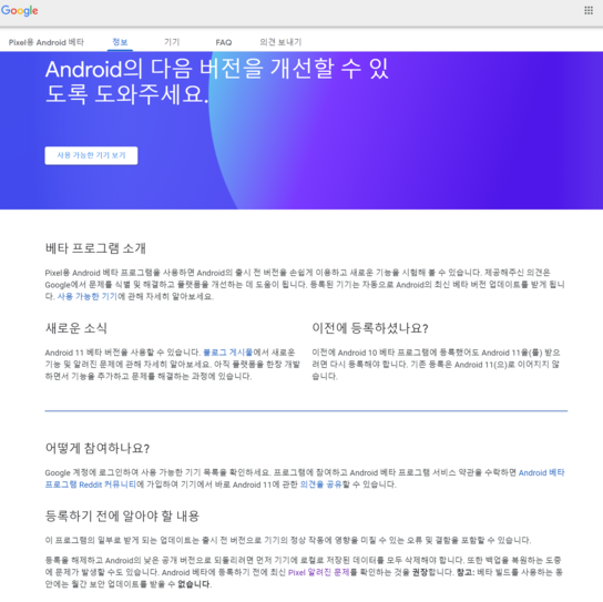 아래 사이트를 클릭 후 약관 베타 프로그램에 가입하게 되면 픽셀폰에서 업데이트가 가능하다.