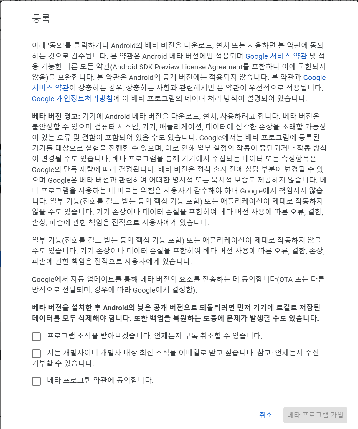 체크박스 3개 모두 체크 후 베타 프로그램 가입 버튼을 클릭하면, 다운로드할 준비가 완료된 것이다.