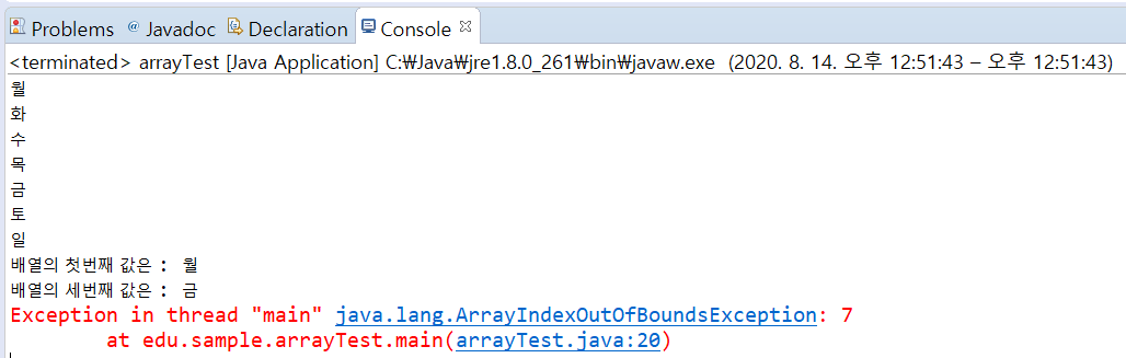 System.out.println("배열의 여섯번째 값은 : " + week[7]);