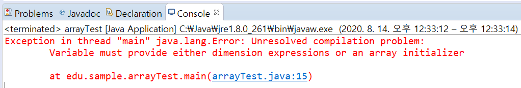 배열은 길이는 고정 되어 있다. 만약 크기를 부여하지 않고 아래와 같이 초기화하면 컴파일 오류가 발생한다.