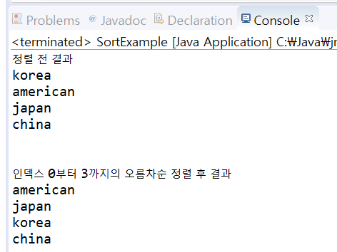 System.out.print("nn인덱스 0부터 3까지의 오름차순 정렬 후 결과n");