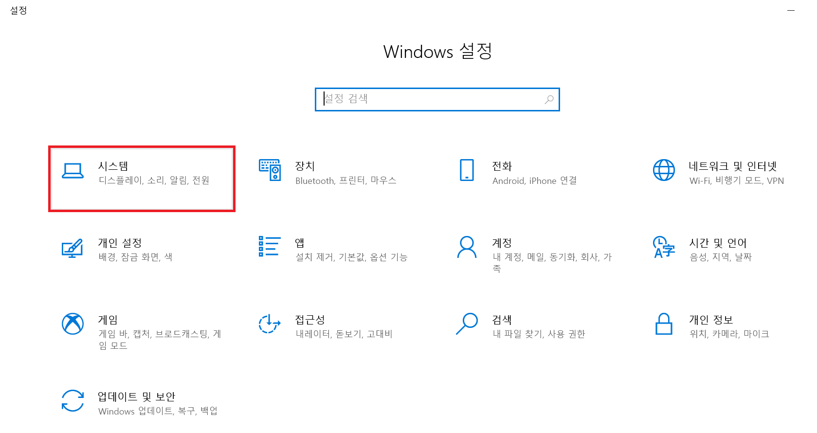 스탭1. 윈도우 작업표시줄에서 검색필드에 “설정“을 타이핑 하여 윈도우 설정으로 이동한다.