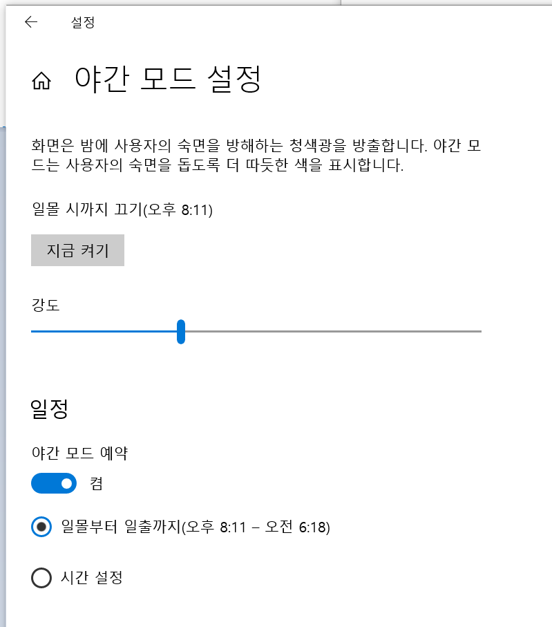 스탭4. 야간 모드 설정을 클릭하여 원하는 강도와 시간 설정