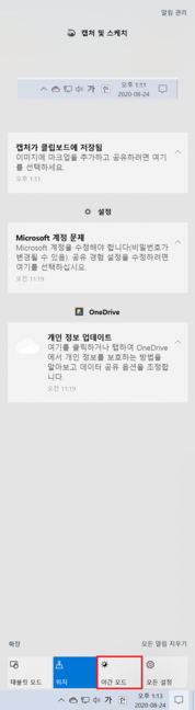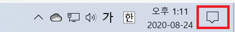 스탭1. 윈도우 하단의 작업표시줄 오른쪽 끝에 “알림” 아이콘을 클릭한다.