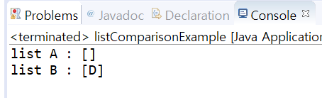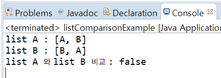 만약, 두 개의 리스트 중 하나를 순서를 바꿔서 추가한 경우 서로 같지않음으로 리턴된다. 같은 값으로 비교가 필요한 경우 Collections.sort() 메소드를 사용하여 두개의 배열을 오름차순으로 정렬 후 비교하면 true값을 리턴한다.