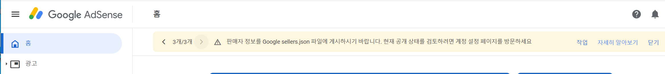 구글애드센스에 로그인하였더니 알림메시지가 노출되었다. 판매자 정보를 Google sellers.json 파일에 게시하시기 바랍니다. 현재 공개 상태를 검토하려면 계정 설정 페이지를 방문하세요