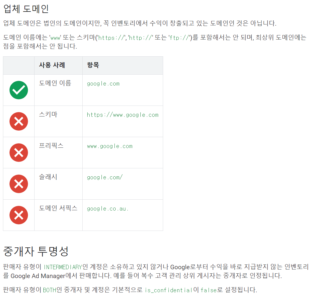 | seller_type | PUBLISHER 또는 INTERMEDIARY이거나 BOTH입니다. 수익을 창출 중인 도메인을 소유하고 있거나 Google로부터 수익을 바로 지급받는 판매자는 PUBLISHER로 분류됩니다. 그렇지 않은 판매자는 INTERMEDIARY로 분류됩니다. 두 카테고리 모두에 속하는 판매자는 BOTH로 분류됩니다. |