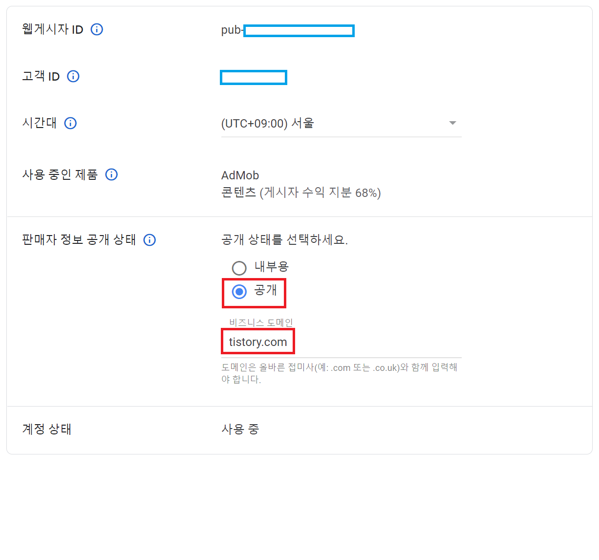 판매자 정보 공개상태를 “공개”로 변경한다. 비즈니스 도메인에 tistory.com을 타이핑한다. 30분 내외로 처리된다.