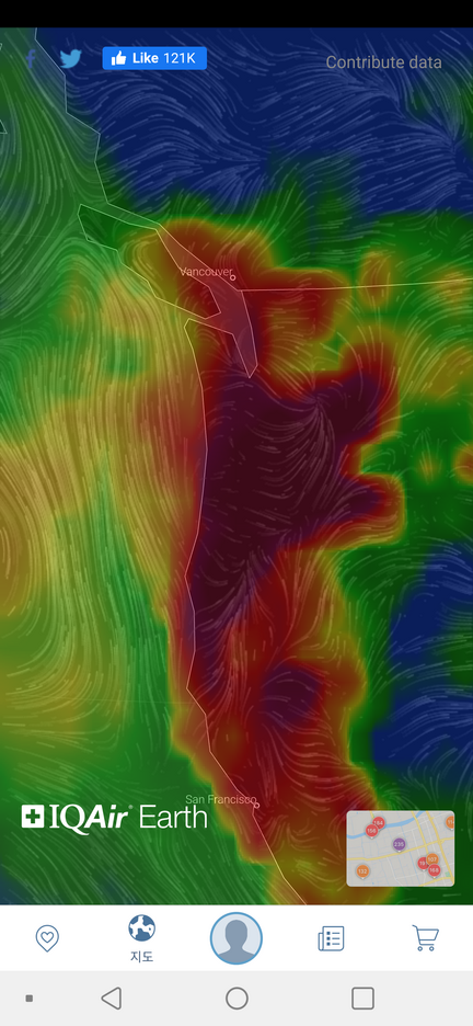 미국 캘리포니아 산불의 영향으로 밴쿠버의 하늘도 파란하늘은 사라졌다. 미세먼지농도는 170까지 치솟았다. 한국에 있을 때도 중국발 미세먼지로 먼 산이 보이지않았다. 오늘 밴쿠버 하늘이 그랬다.