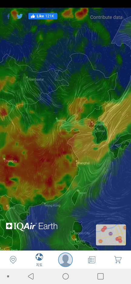 한국은 미세먼지 농도가 어떨까 궁금하여 확인하였다. 여전히 중국발 미세먼지가 한국을 관통해 일본까지 퍼지는 현상이다. 히지만 한국은 오늘 전국에 비가 오는 관계로 미세먼지는 맑음이다.