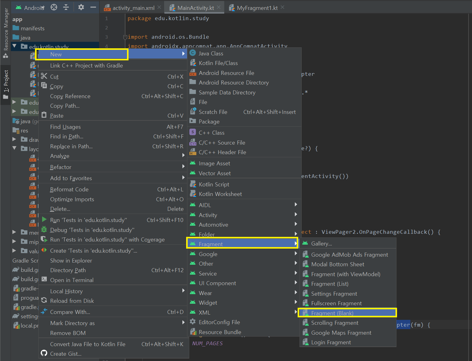 제일 먼저 페이지로 사용할 프레그먼트 레이아웃을 추가하자. 클래스 파일과 레이아웃 xml파일을 동시에 만들어보자