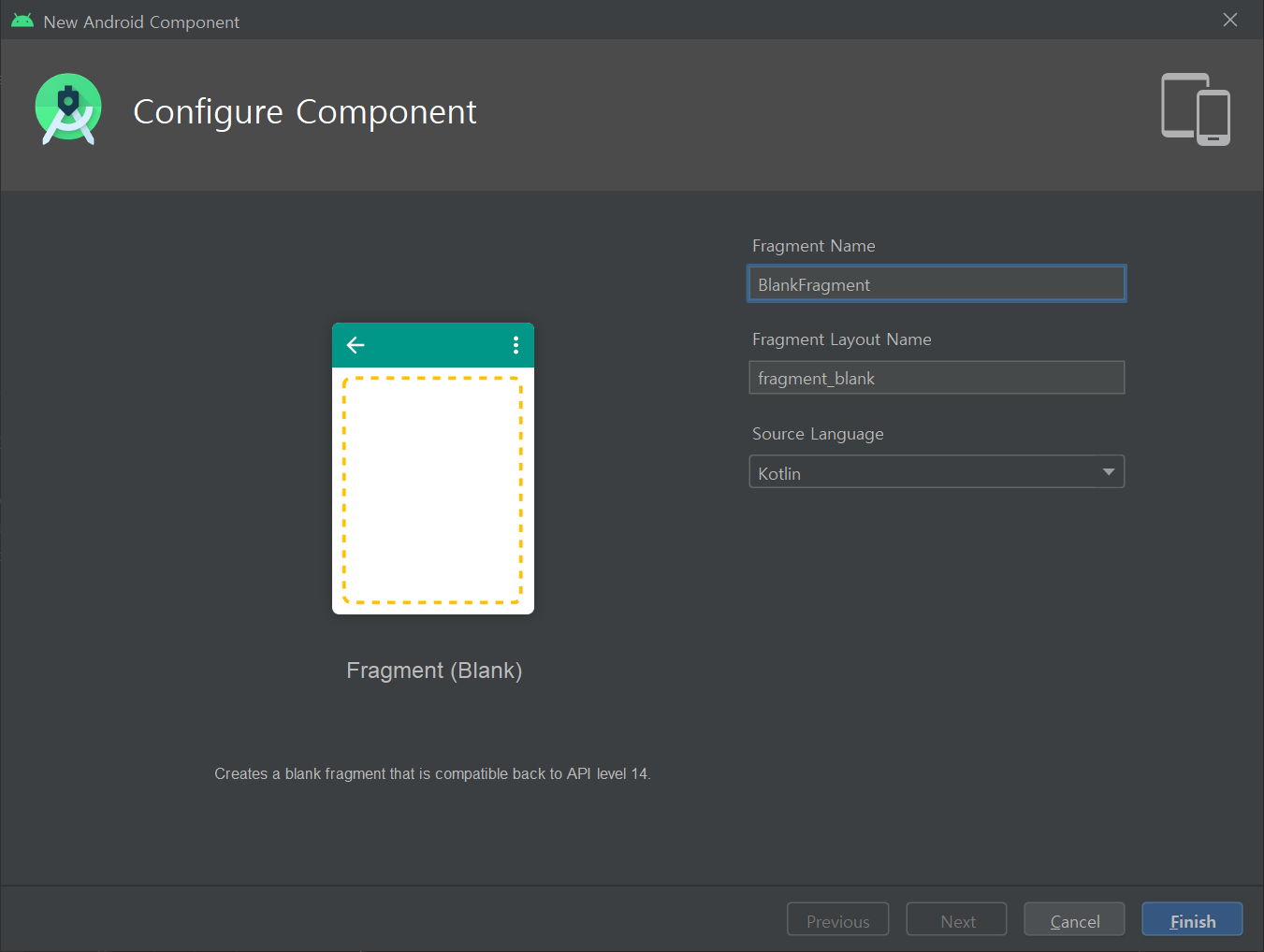 프레그먼트 이름과 개발한 언어를 선택 후 Finish버튼을 클릭하면 완료된다.