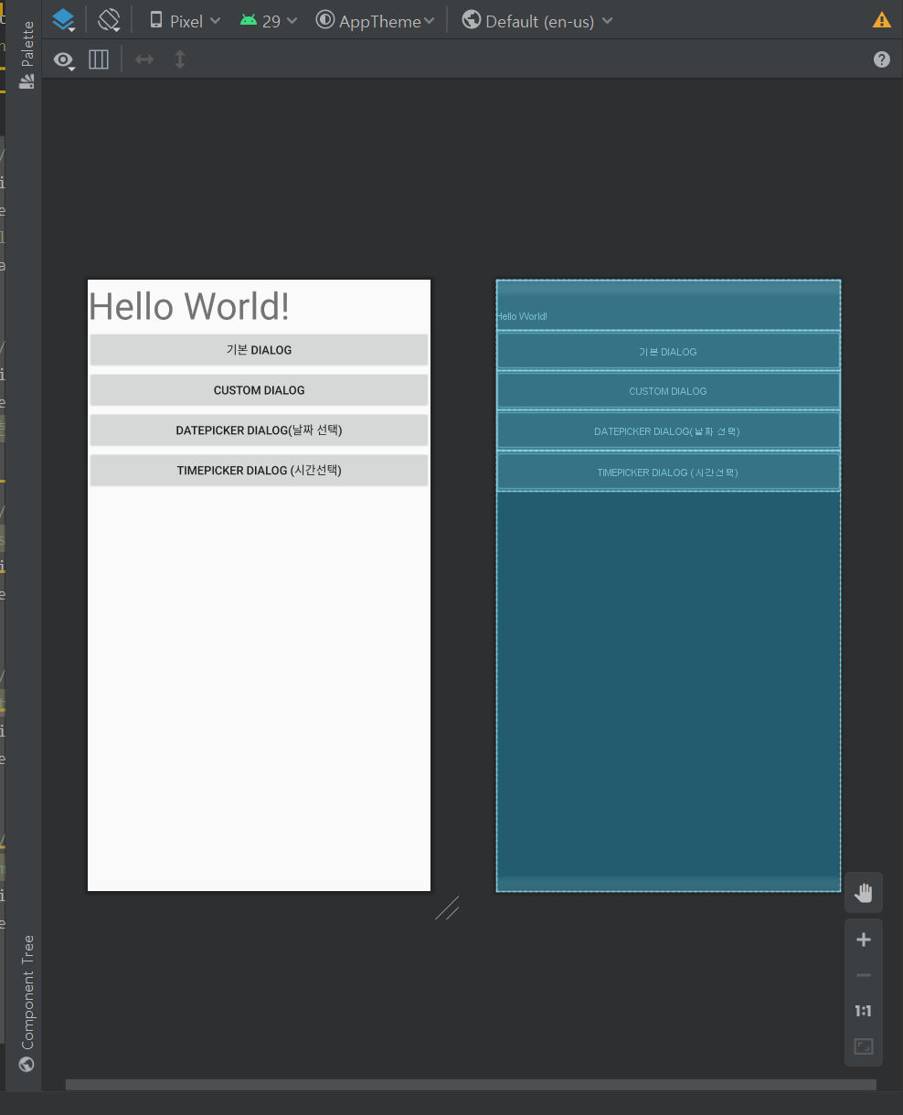 AlertDialog는 작은 팝업창을 의미한다. AlertDialog.Buider() 메서드를 사용하여 생성한다. 간단하게 사용하기에 용이하지만 텍스트위치 버튼 위치 등 UI를 변경할 수 없다. 기본적으로 3가지 버튼을 지원한다. DialogInterface.BUTTON_POSITIVE : 예