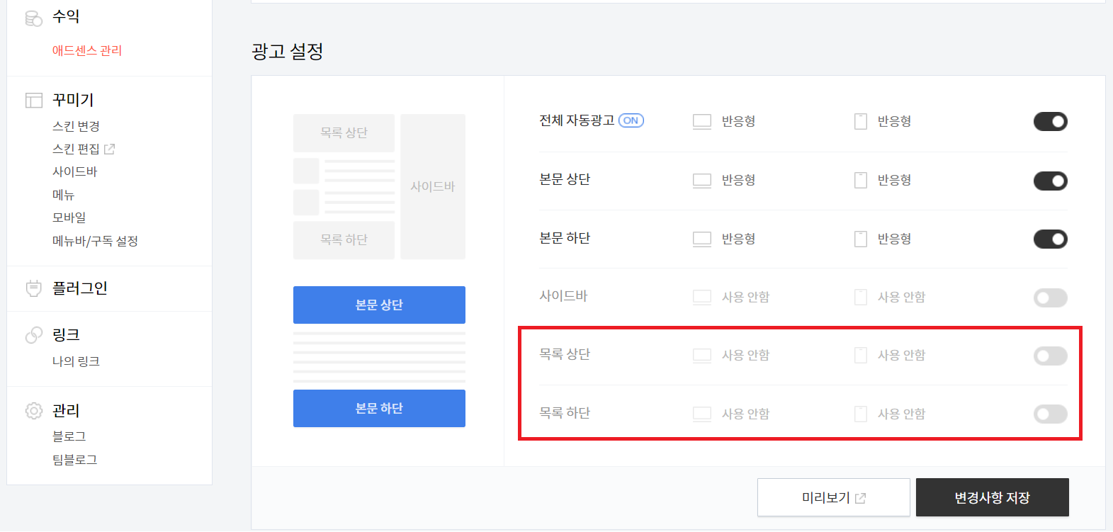 [티스토리]수익-에드센스관리 : 목록 상단[revenue_list_upper]/하단 광고[revenue_list_lower] 추가하기