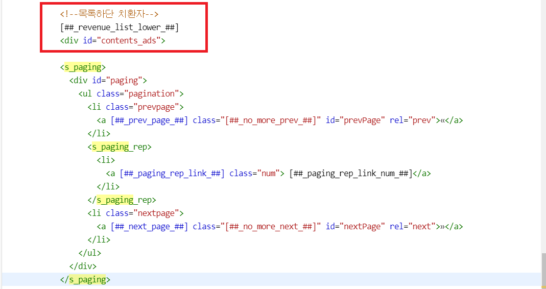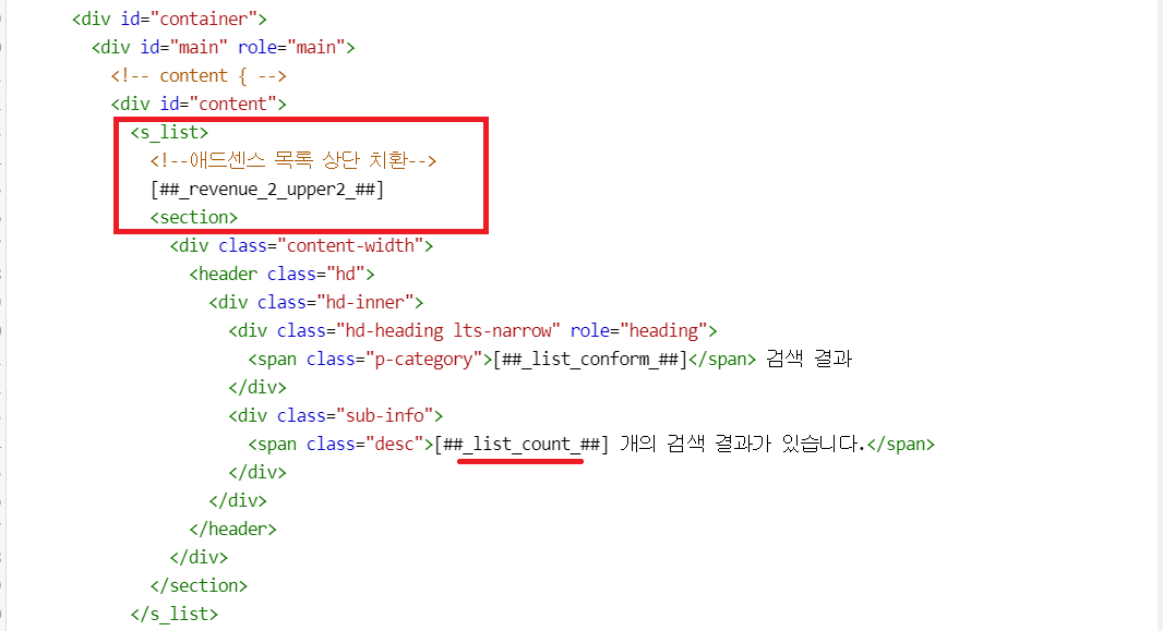 CTRL + F 단축키를 눌러 검색어로 s_list를 검색하거나 list_count를 검색 후 <s_list>태그 바로 아래 치환자를 추가한다.