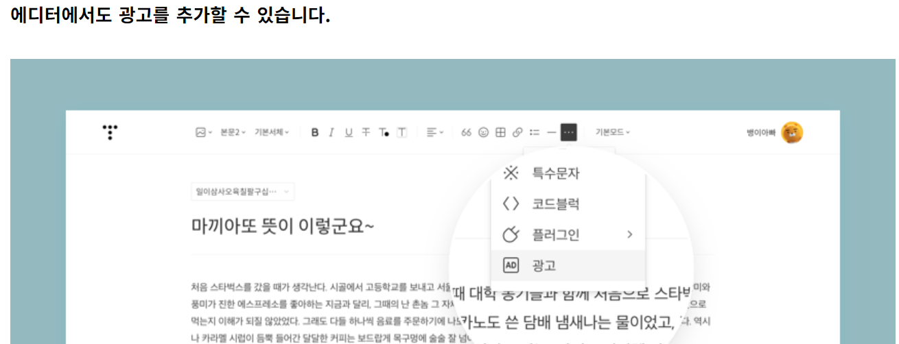 글 작성시 본문에 에디터에서 점3개 아이콘을 클릭 후 광고를 추가할 수 있다. (애드핏만 가능하다.)