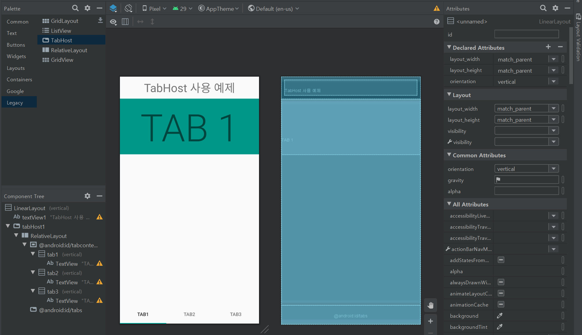 1. TabWidget의 id 속성값은 반드시 “@android:id/tabs” 값을 지정해야 합니다. 사용자가 정의할 수 없습니다.