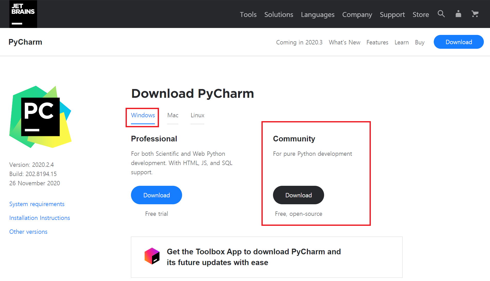 파이참 다운로드 페이지 : www.jetbrains.com/pycharm/download/#section=windows