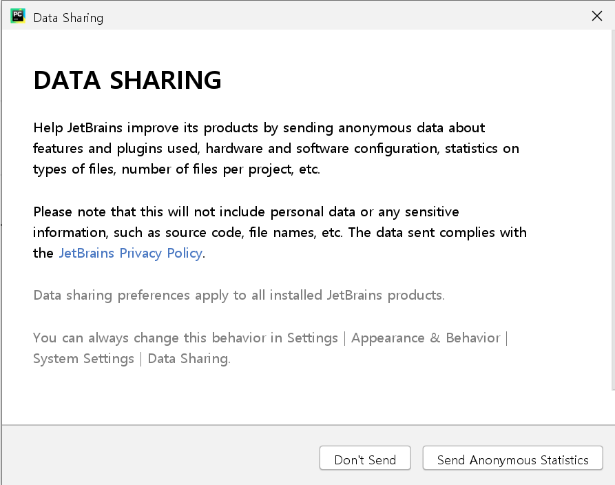 4. 다음으로 데이터 공유인데, 데이터 공유를 원치 않을 경우 don’t send를 클릭 후 넘어갑니다.