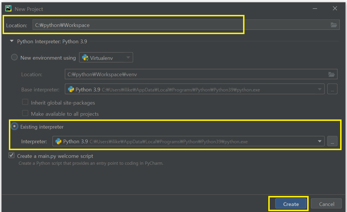 8. 프로젝트 폴더 경로를 지정한 후 Existing interpreter를 선택 후 Create버튼을 클릭합니다.
