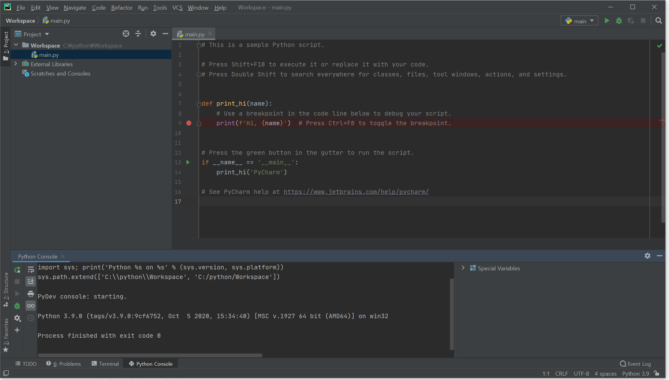 9. 개발할 준비가 완료되었습니다. main.py 스크립트 생성을 체크하였음으로 main.py가 기본적으로 작업페이지로 노출됩니다.