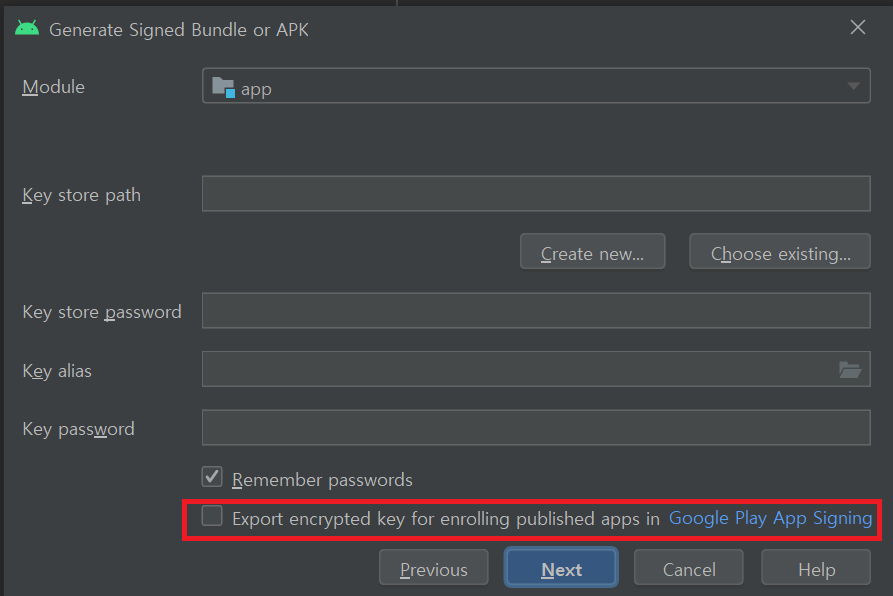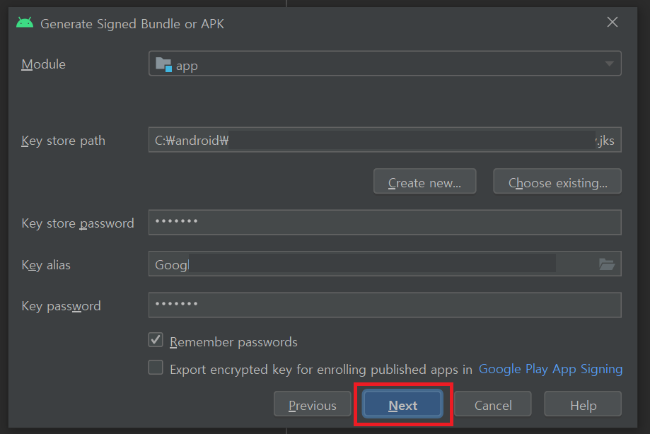 기존 앱 서명 키로 App Bundle에 서명하고 나중에 Play 앱 서명에 앱을 등록하려면 Export encrypted key 옆의 체크박스를 선택하고 경로를 지정하여 서명 키를 암호화된 *.pepk 파일로 저장합니다. 그런 다음 암호화된 앱 서명 키를 사용하여 기존 앱을 Play 앱 서명에 등록할 수 있습니다.