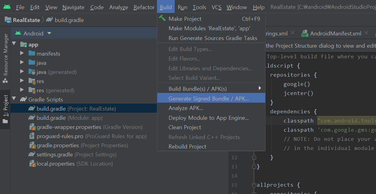 1.메뉴 바에서 Build > Build > Generate Signed Bundle/APK를 클릭합니다.
