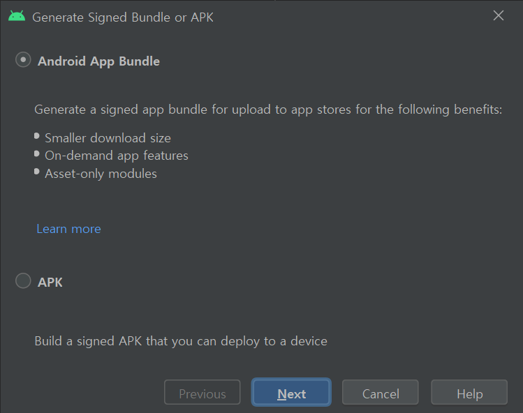 2. Generate Signed Bundle or APK 대화상자에서 Android App Bundle 또는APK를 선택하고 Next를 클릭합니다.