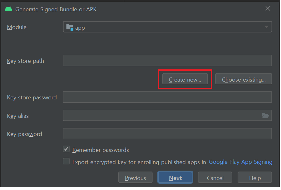 3. Key store path 필드 아래에서 Create new를 클릭합니다.
