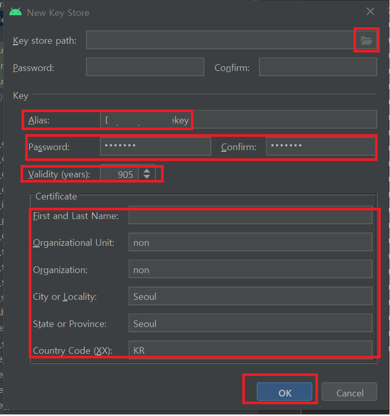 - Key store path: 키 저장소를 생성할 위치를 선택합니다.