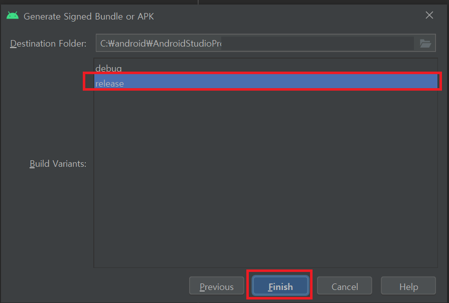 6. release을 선택 후 Finish버튼을 클릭합니다.