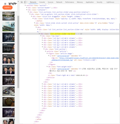 뉴스타파 사이트의 “세금도둑추적2020” 뉴스 크롤링을 시도해봅니다. 뉴스부분의 HTML을 파싱하기위해서 크롬 브라우저를 열고 newstapa.org 사이트를 열어요. 그리고 난 후 F12키를 눌러 개발자 도구를 사용합니다. 왼쪽에 커서버튼을 눌러 뉴스 하나를 선택하여, 뉴스를 감싸고 있는 최상의 div태그를 찾아요. 노란색 블럭된 부분이 바로 뉴스가 모여있는 태그입니다. 파싱할 대상을 찾았으니 이제 코딩을 시작해볼까요?